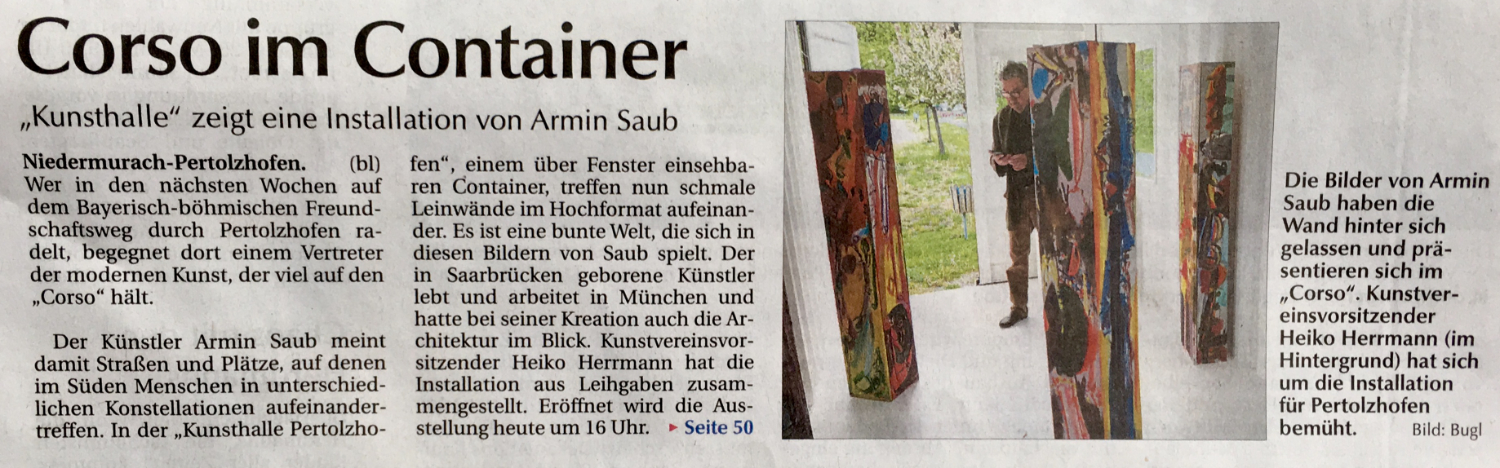 Die Idee für diese Installationen mit Fensterbildern entstand, weil Armin Saub von der Gewohnheit der Menschen in südlichen Ländern, jeden Abend scharenweise zum „Corso“ auf die Straßen und Plätze zu gehen, sehr beeindruckt war: „Es muss ein Bedürfnis sein, sich zwischen den Häusern, unter einer Dusche aus Gesprächen, gleichzeitig zusammenzufinden und auseinanderzugehen… Der Corso ist das aufgebrochene Labyrinth der Passagen durch Zeitloses und Mode, des ekstatischen Gedankenaustausches, des spielerisch angenommenen Ein- oder Missverständnisses, das korrigierbar gehalten wird durch das Erscheinen der Menschen“. Auf diese urbane Identität im Zusammenleben, im Vermischen von Öffentlichem und Privatem, beziehen sich Armin Saubs improvisierte Corso-Installationen, die Lust machen möchten an wechselseitiger Ergänzung zwischen den Bildern und den Betrachtern, die sich in diesem Bildercorso bewegen. Erstmals präsentierte Saub eine Corso-Installation in der Otto-Galerie in München, im April 1989.