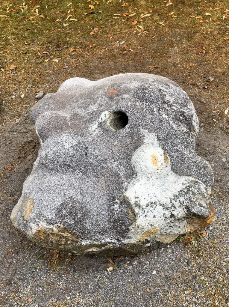 Martin Schneider reiste mit einer Tasche voller Meissel und Hämmern Anfang September in Pertolzhofen an. Im Dürnersdorfer Steinbruch von der Firma Huber Rappl ( Stifter des Steins) fand Martin einen schönen Stein, den die Gemeinde mit ihrem Schaufelbagger vor den Kindergarten transportierte. Dort merkten wir, der Stein hatte unten poröse Strukturen, die würden während der Arbeit am Stein wohl abfallen, so zogen wir nochmal in den Steinbruch und suchten einen neuen Stein und fanden dieses wunderbare Teil, das mit einem Bohrloch für Sprengsstoff versehen war, was schon einmal eine Herausforderung für die Formfindung des Steins war.